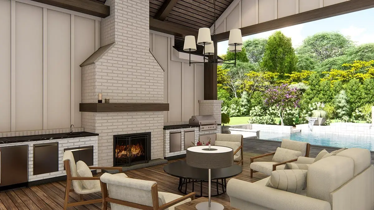 - Indoor-outdoor connection: Seamless flow from kitchen to porch and outdoor kitchen space.