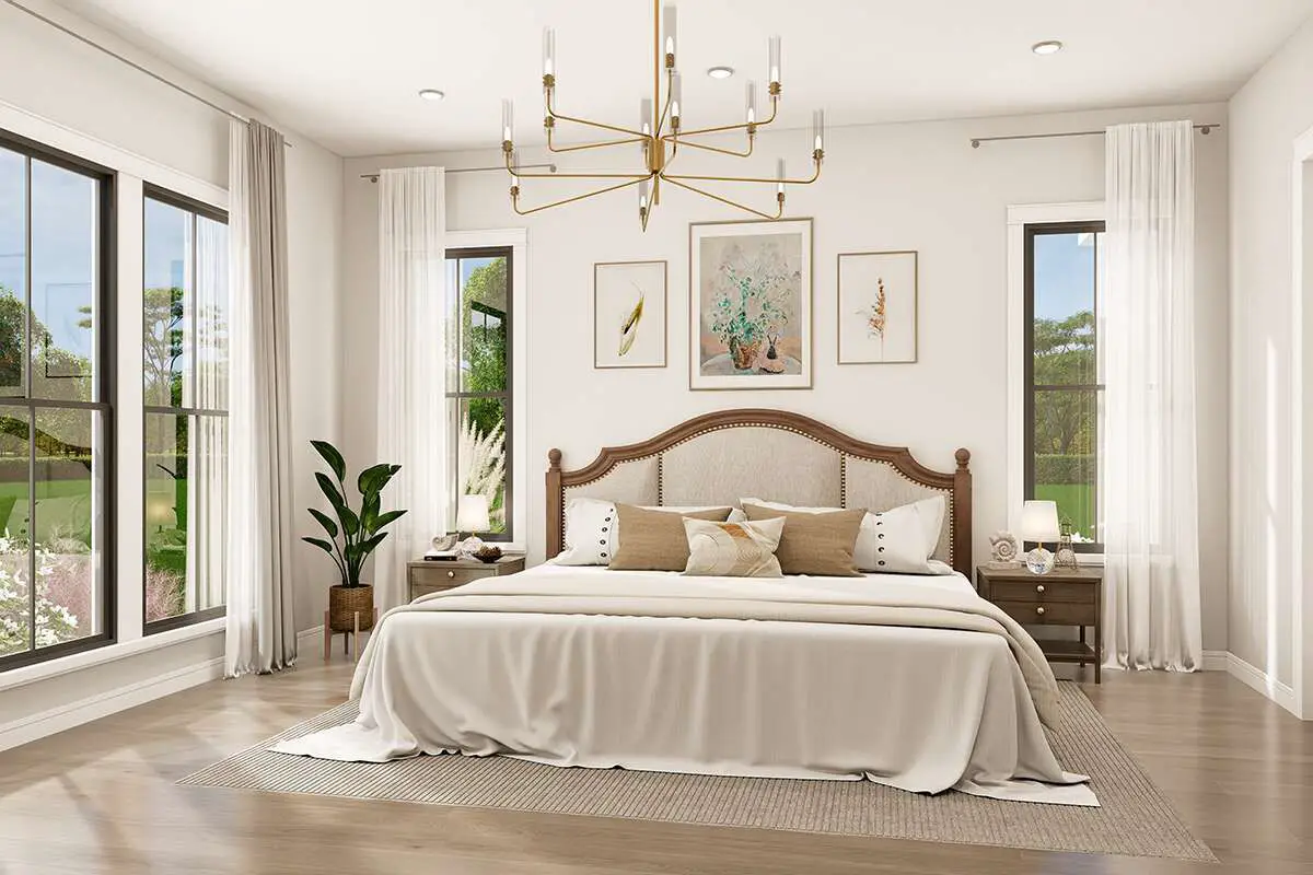 This serene retreat features a tray ceiling, rear-facing windows, and direct access to the back porch. The luxurious ensuite bath includes a soaking tub, separate shower, dual vanities, and a large walk-in closet for ultimate convenience and relaxation.