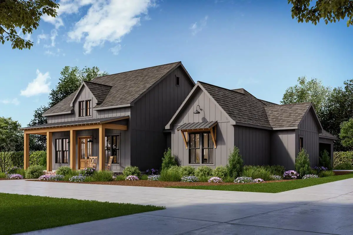 The gabled rooflines, board and batten siding, and covered front porch framed by timber posts create a clean and elegant curb appeal.