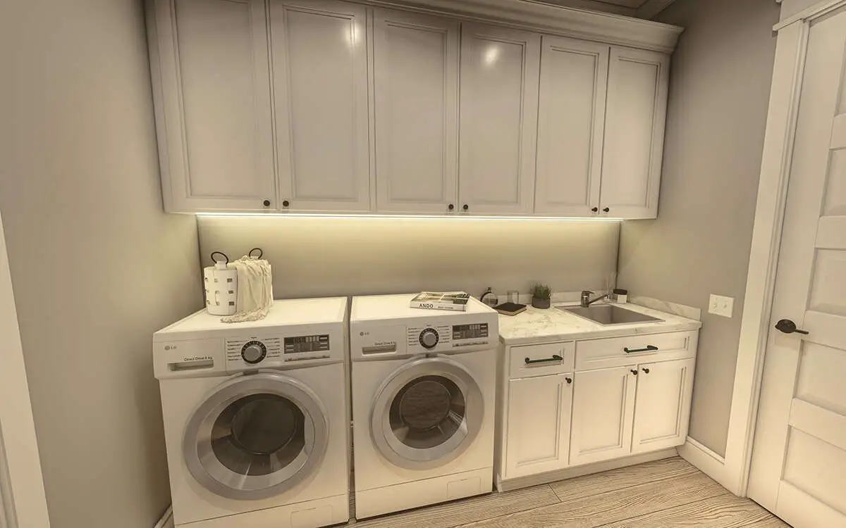Just off the garage, the mudroom includes built-in lockers to catch the daily mess. The laundry room is surprisingly roomy, with space to fold, sort, and maybe even hide from your responsibilities for a minute. There’s also a powder room for guests and a linen closet where you’ll actually want to keep towels for once.