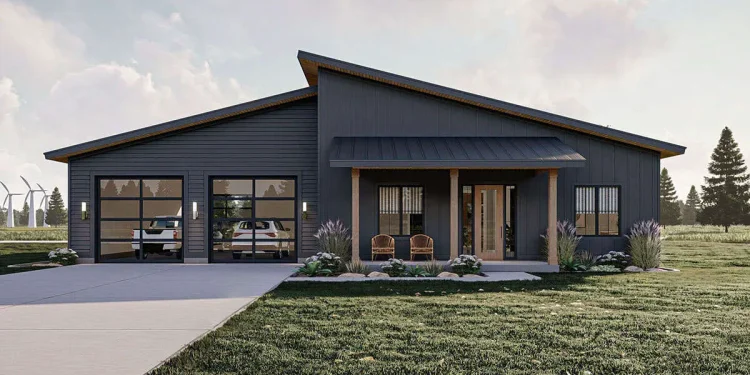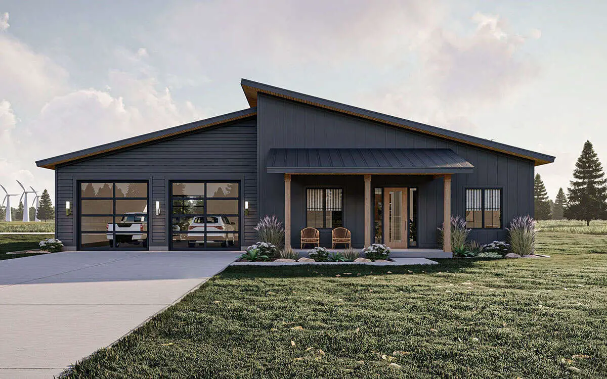 This sleek, 2,016‑sq ft modern plan offers two bedrooms, two baths, and enough garage space to park dreams (or three cars). With clean lines, vaulted ceilings, and smart layout flow, it feels contemporary without being cold—perfect if you want modern vibes with a welcoming soul.