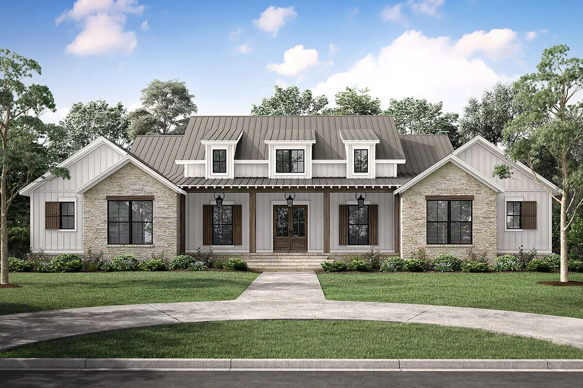 This home boasts crisp lines, exposed rafters, window dormers, board-and-batten siding with stone accents, and a grand covered front porch. Balanced wings make it feel intentional and stable. A rear porch invites outdoor living and connects directly to the dining area. 6