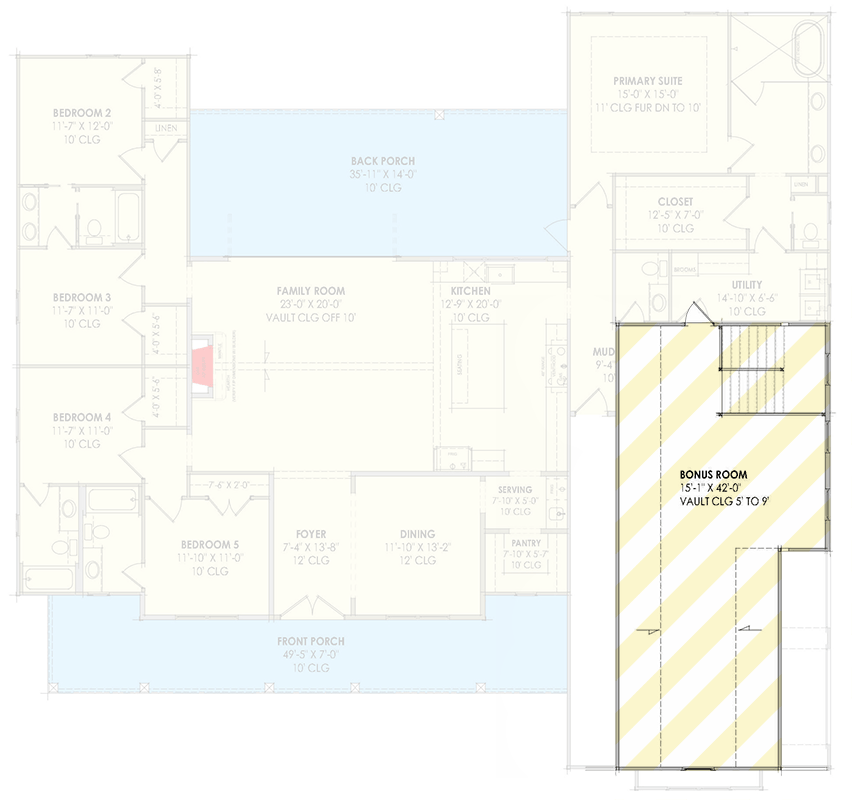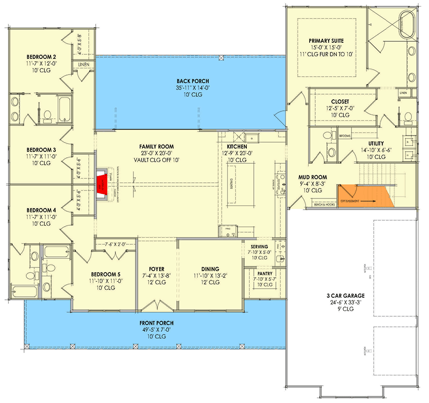 Porches play an integral part in this design. The expansive front porch welcomes visitors and affords comfortable outdoor seating, while the rear porch provides a shaded outdoor room directly connected to the interior gathering spaces. These areas extend your living space beyond interior walls, enhancing comfort and enjoyment across seasons. Together, the porch areas create ideal settings for al fresco dining, lounging, or entertaining friends and family.