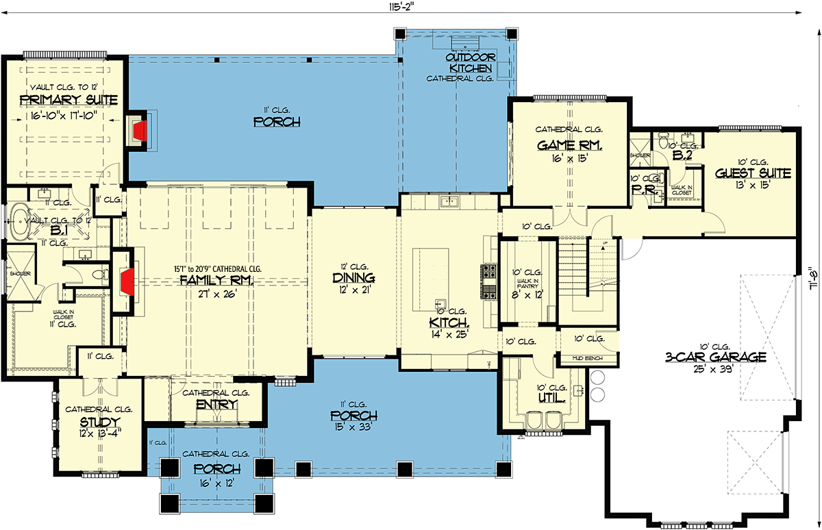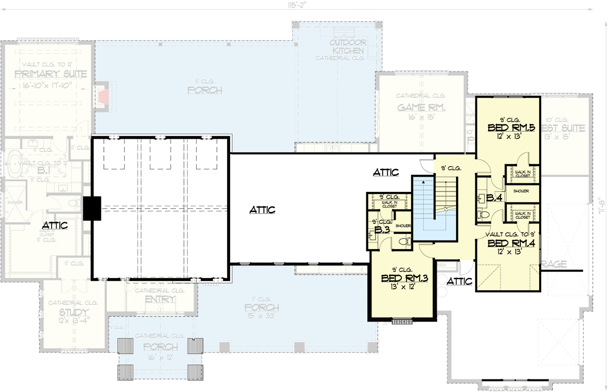 Utility spaces such as a mudroom adjacent to the garage entry and a dedicated laundry room help support everyday routines while keeping main living areas calm and organized. Thoughtful placement of windows enhances daylight without compromising privacy, and higher ceilings in shared zones help create a sense of openness without added construction complexity.