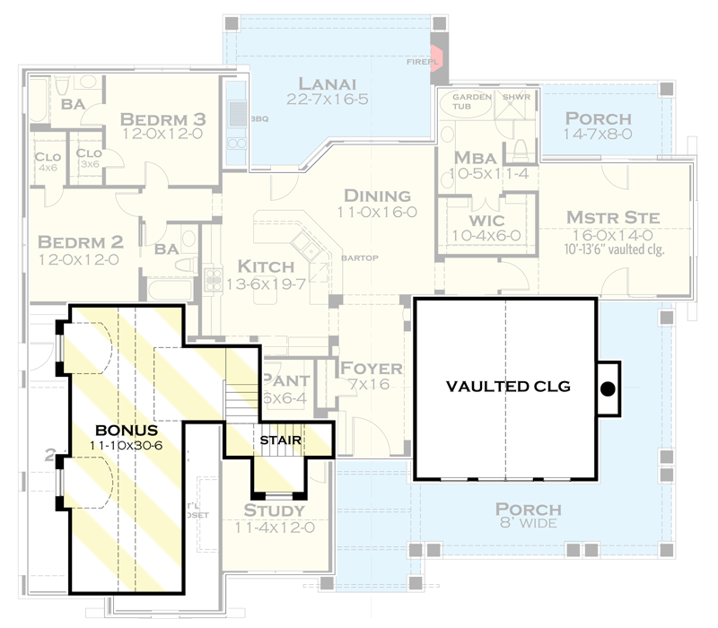 Outdoor living plays a central role in this cottage plan. The covered front porch invites you to relax and take in views, while the rear lanai creates a natural extension of the interior living spaces. An outdoor fireplace and kitchen area elevate these exterior zones, offering delightful places for gathering, cooking, or quiet moments in the fresh air. These thoughtful outdoor connections expand the home’s usable space and enhance daily enjoyment of your surroundings.
