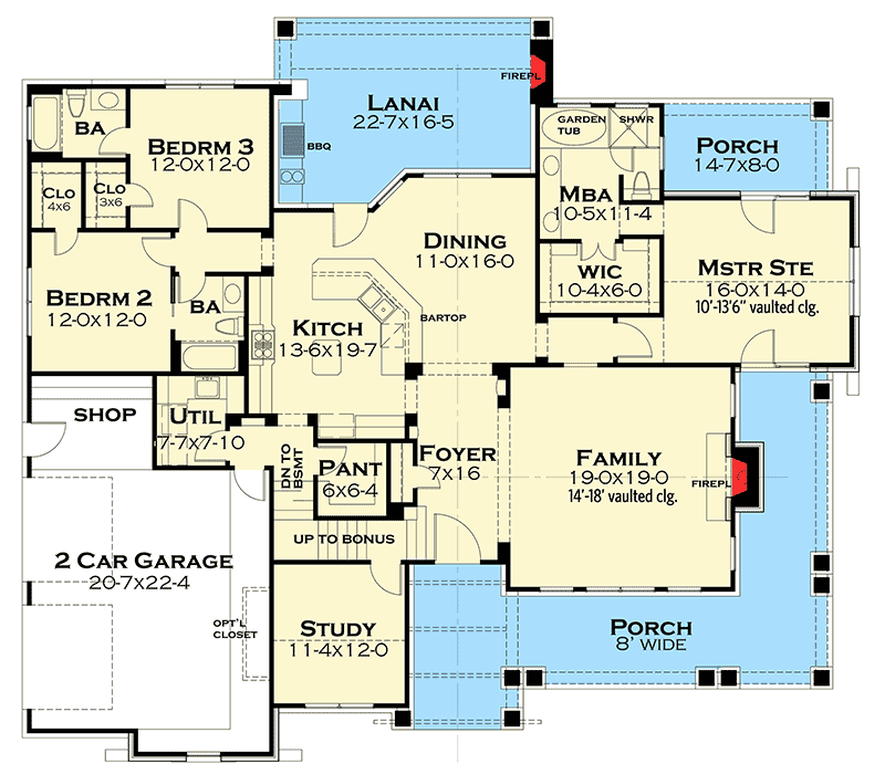 Everyday convenience is a strong theme in this plan. The garage, positioned off to the side, includes a shop area with its own entrance — ideal for tools, projects, and storage. A mudroom transition zone helps keep daily comings and goings organized, while a vaulted study near the front provides a flexible area for quiet work or creative pursuits. Strategic closet placement and ample natural light complement the thoughtful layout, making daily routines feel easy and well-supported.