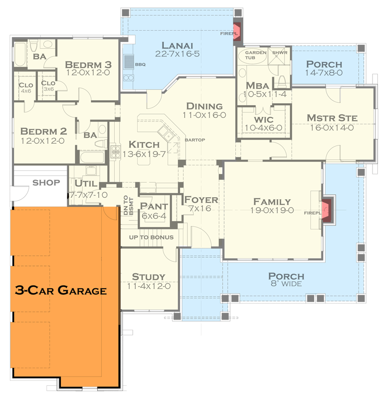 Outdoor living plays a central role in this cottage plan. The covered front porch invites you to relax and take in views, while the rear lanai creates a natural extension of the interior living spaces. An outdoor fireplace and kitchen area elevate these exterior zones, offering delightful places for gathering, cooking, or quiet moments in the fresh air. These thoughtful outdoor connections expand the home’s usable space and enhance daily enjoyment of your surroundings.