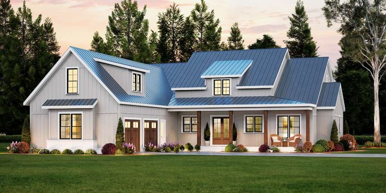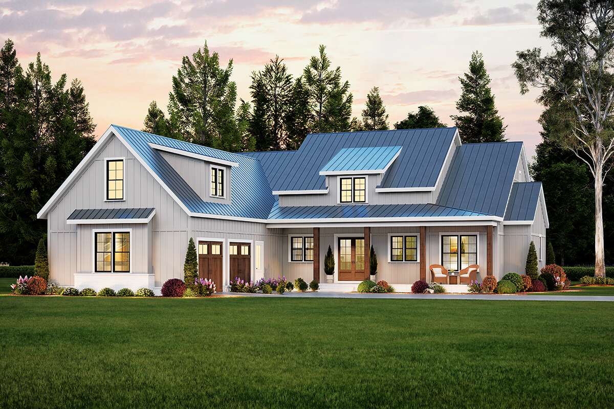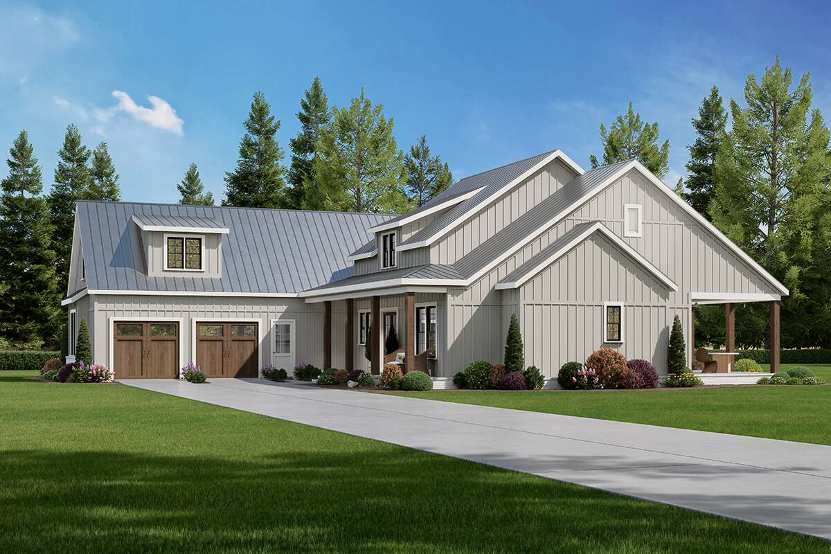 The exterior captures modern farmhouse charm with clean rooflines, balanced gables, and a welcoming covered front porch. Thoughtfully placed windows and simple yet striking trim details give the facade both rhythm and character. The combination of vertical and horizontal siding adds subtle texture, while the porch invites casual relaxation and creates a hospitable transition from outside to interior living. The overall look feels composed and timeless, suited to rural, suburban, or countryside settings alike.