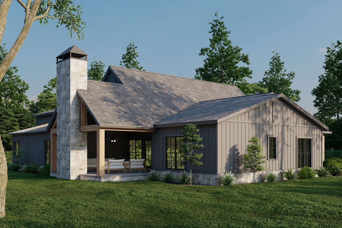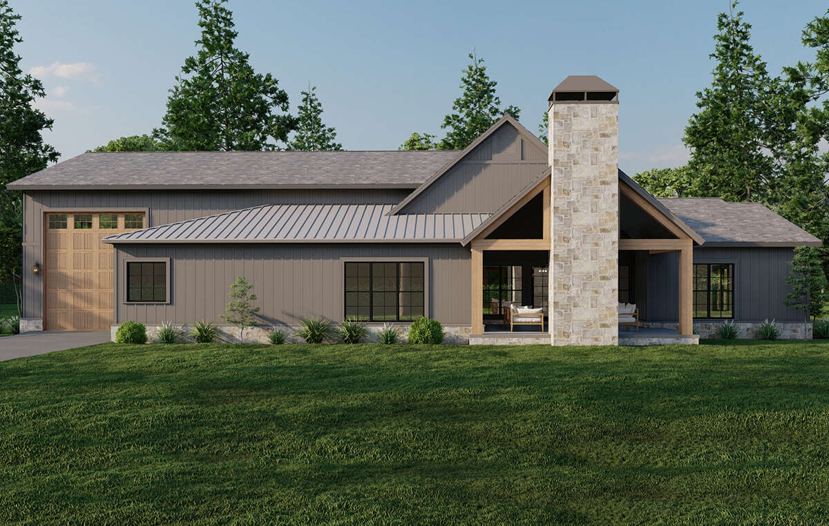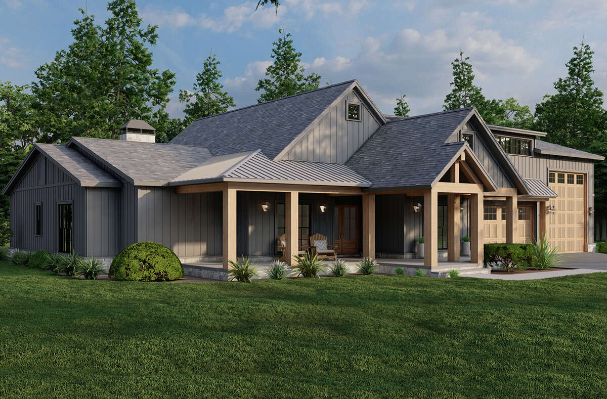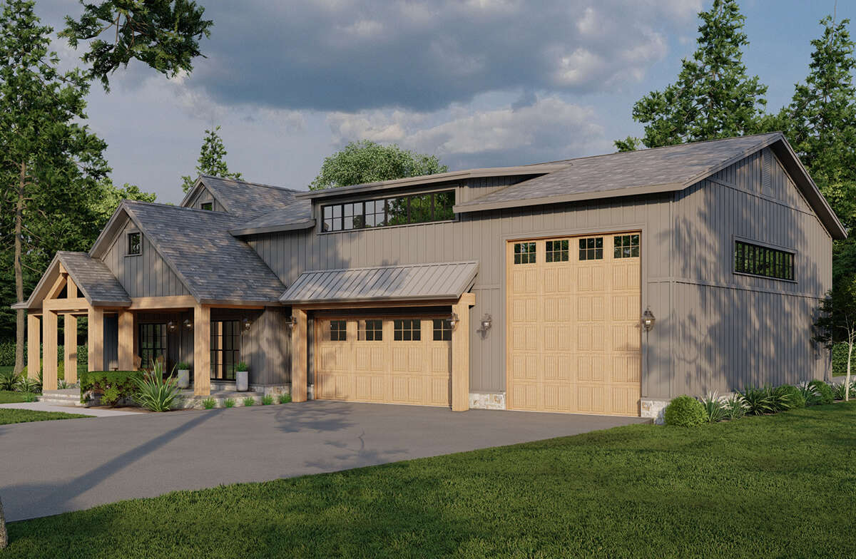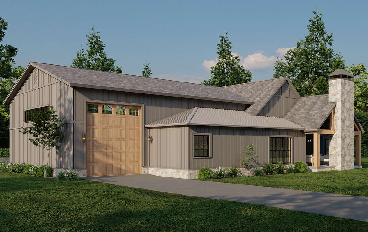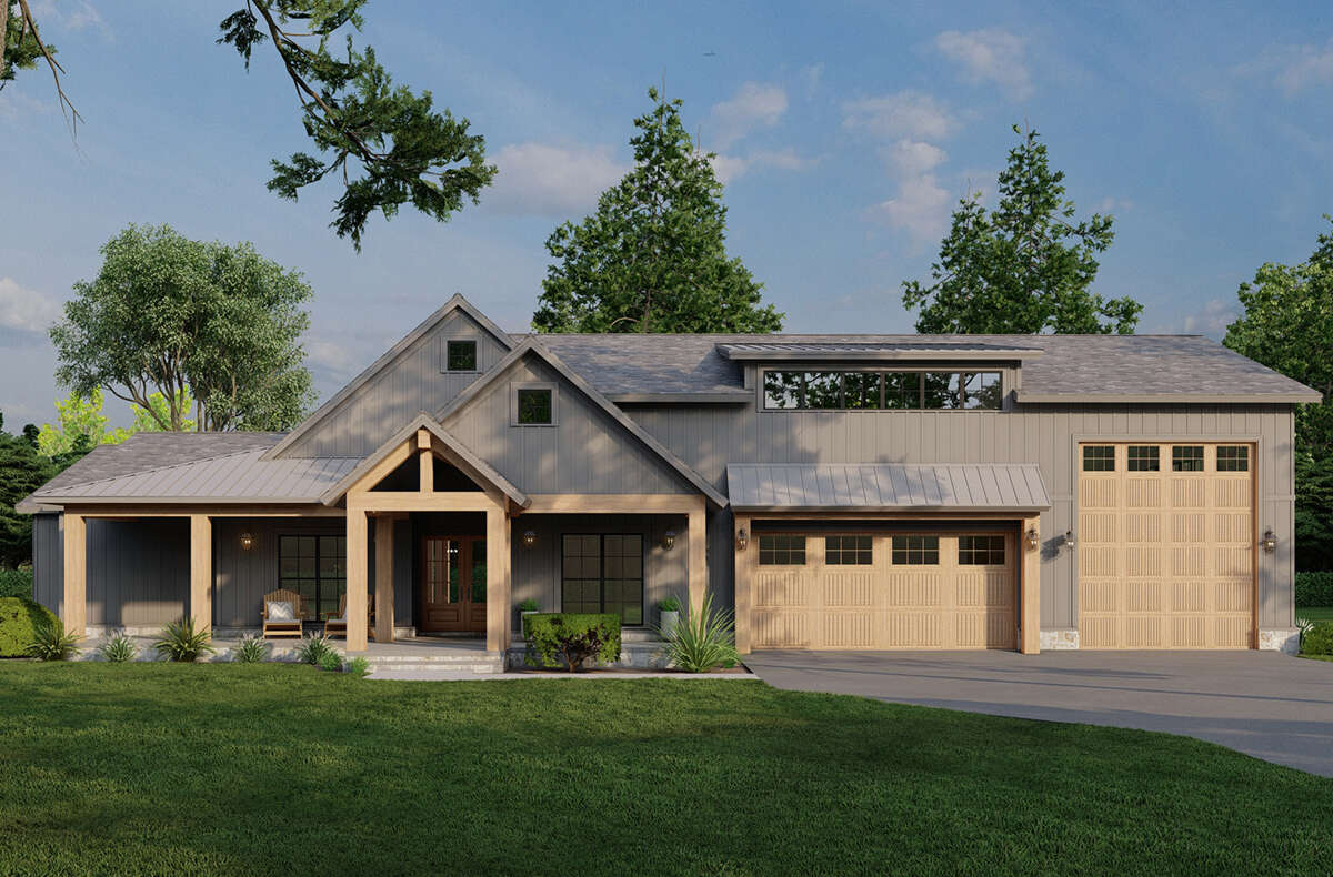 The exterior captures the spirit of a classic barn transformed into a comfortable, stylish home. Clean rooflines and barn-inspired elements give the facade architectural interest without excessive ornamentation. A broad covered front porch invites you to linger and enjoy the surrounding landscape, while expansive openings and well-proportioned gables introduce depth and presence. Thoughtful details such as vertical siding and rustic trim balance modern simplicity with timeless rural character, creating a home that feels both grounded and welcoming.