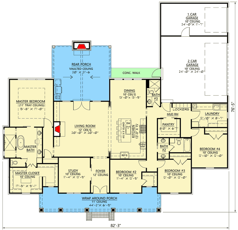 This modern farmhouse plan provides approximately 2,815 square feet of well-designed living space that blends contemporary style with timeless farmhouse character. The layout centers around open living spaces, thoughtful private retreats, and an inviting vaulted rear porch that encourages indoor-outdoor connection. With multiple bedrooms, functional circulation, and practical living zones, this design delivers both everyday comfort and gracious entertaining capacity.