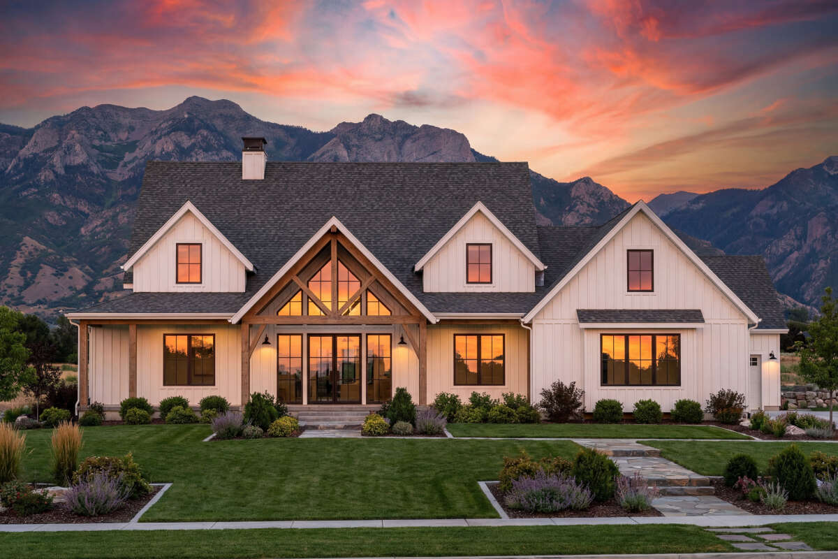 The exterior radiates modern farmhouse appeal with a harmonious combination of balanced gables, crisp siding textures, and a broad covered porch that anchors the front facade. The porch provides a comfortable space to enjoy morning coffee or greet neighbors, while thoughtful placement of windows adds rhythm and depth to the elevation. A side-entry garage maintains the home’s composed aesthetic while maximizing usable yard space. Overall, the exterior details create a facade that feels timeless, welcoming, and perfectly suited to a range of settings from rolling countryside to upscale suburban lots.