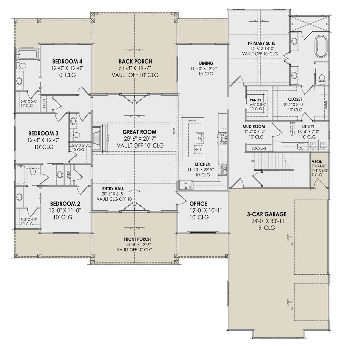 This farmhouse plan includes flexible areas that can be adapted to your lifestyle needs. A room near the front entry can serve as a home office, formal study, or creative space, offering a quiet zone separate from the main living areas. Additional bonus space can be configured as a media room, play area, or hobby zone depending on your priorities. These adaptable spaces enhance the home’s utility without interrupting the overall flow, making the design suitable for evolving family routines and personalization over time.