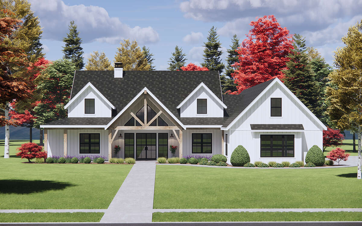 This modern farmhouse plan spans approximately 3,000 square feet of artfully arranged living space that blends functional design with contemporary farmhouse charm. With four bedrooms, three and a half baths, and flexible living areas, the layout provides both open shared spaces for family interaction and thoughtful private retreats. Architectural elements such as clean rooflines, generous windows, and a welcoming porch create a home that feels both inviting and elevated — ideal for relaxed everyday living, gracious entertaining, and seamless indoor-outdoor connection.