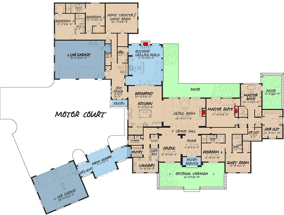 This grand European-style residence offers approximately 5,739 square feet of luxurious living space designed for elegance, comfort, and effortless entertaining. Set around a dramatic motor court and porte-cochere, the plan features five generous bedrooms, multiple baths, and a suite of specialized living zones that elevate everyday life. With abundant gathering spaces, flexible entertainment rooms like a game room and home theater, and expansive outdoor living with grilling areas, this home blends refined architectural detailing with functional flow for families who want both style and substance in a well-designed residence.