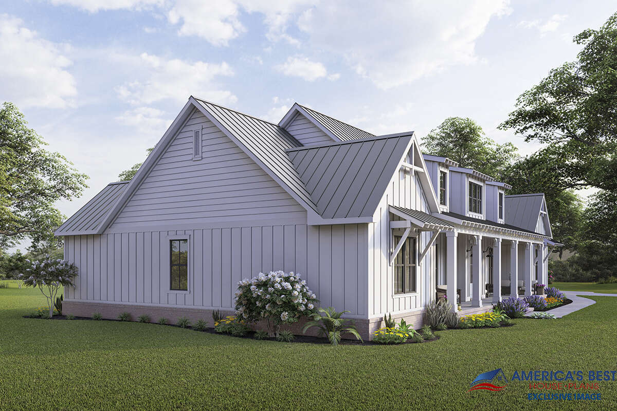 This modern farmhouse plan is ideal for families who want open living spaces without sacrificing privacy. The design encourages connection through its central gathering areas while offering restful retreats through its well-separated bedroom layout. The combination of farmhouse charm and contemporary practicality ensures the home remains both stylish and highly functional.