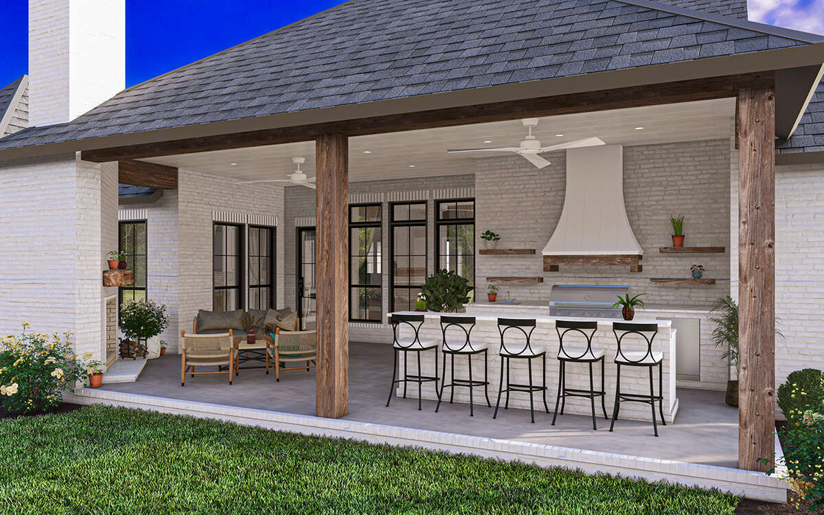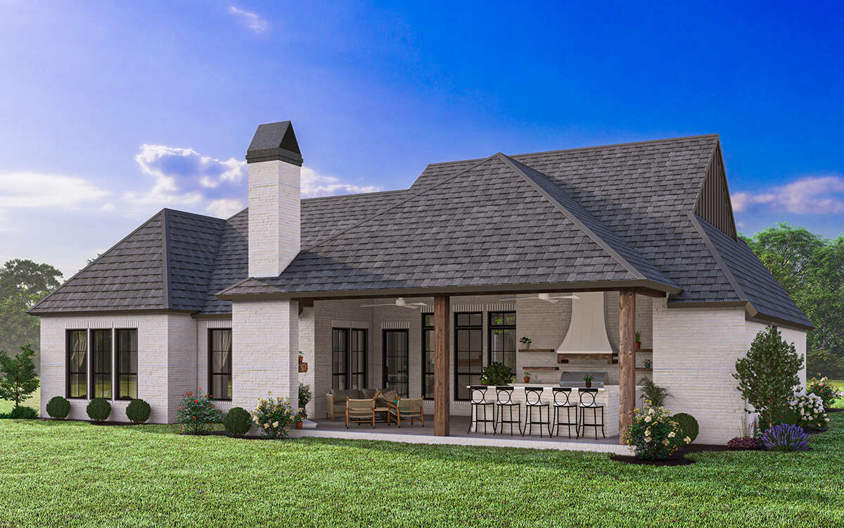 This thoughtfully designed modern farmhouse provides approximately 2,768 square feet of comfortable living space arranged across a spacious single-story layout. With four bedrooms, three full bathrooms, and one half bath, the design blends practical family living with stylish architectural character. The home’s open layout, balanced proportions, and inviting outdoor spaces make it ideal for homeowners who value both everyday functionality and relaxed entertaining.