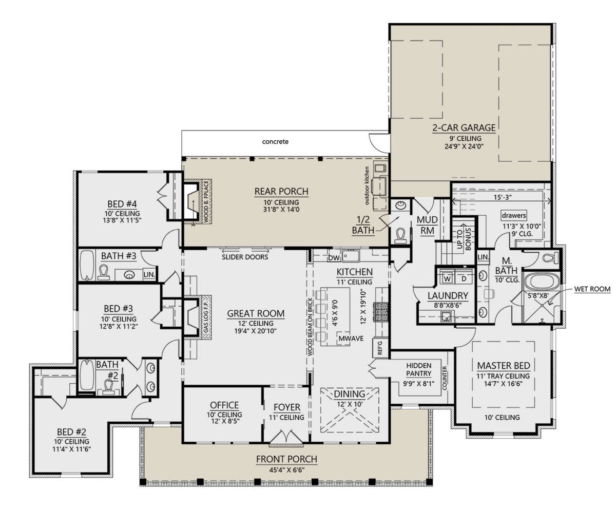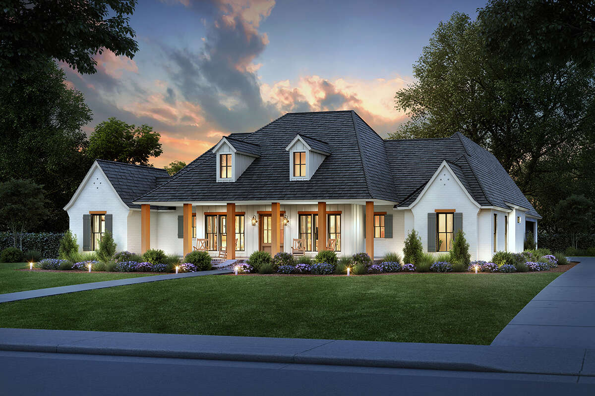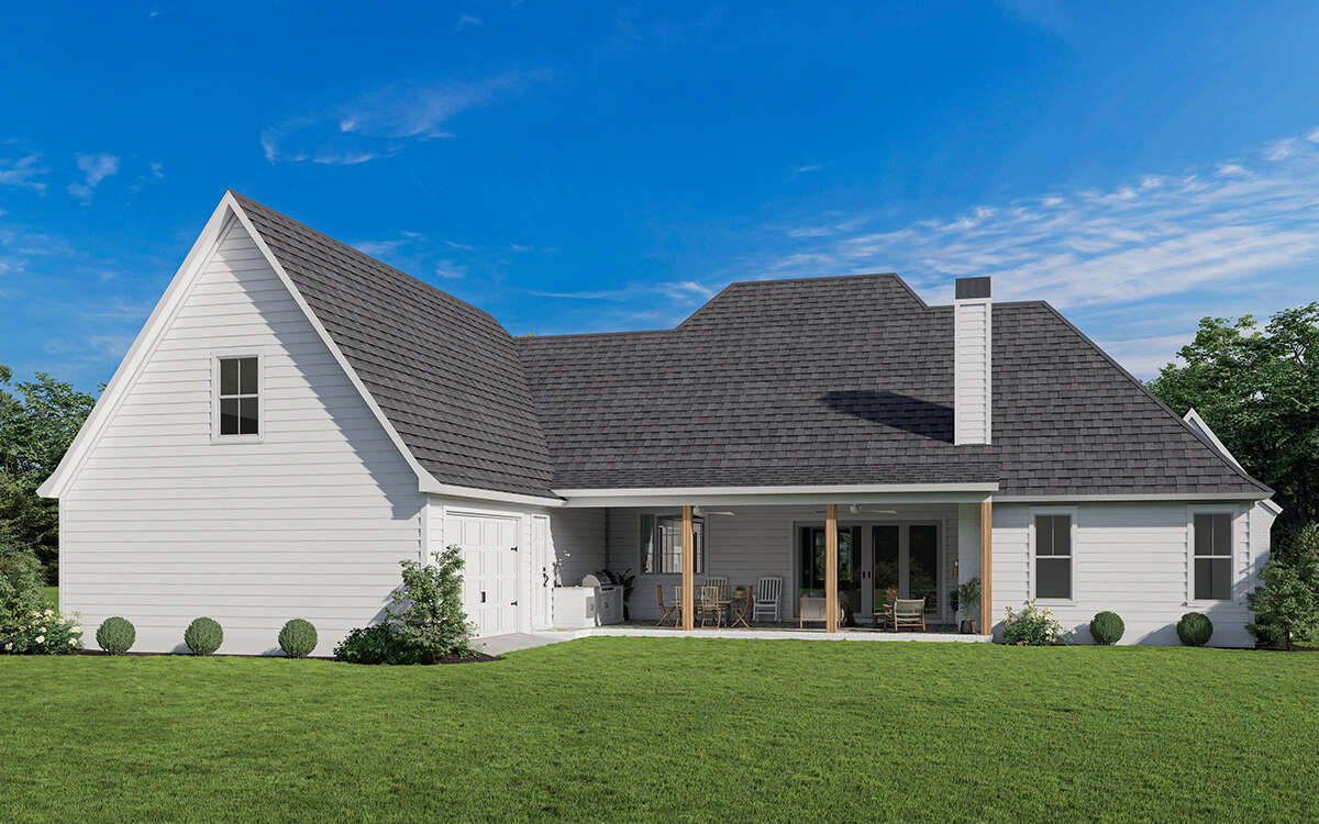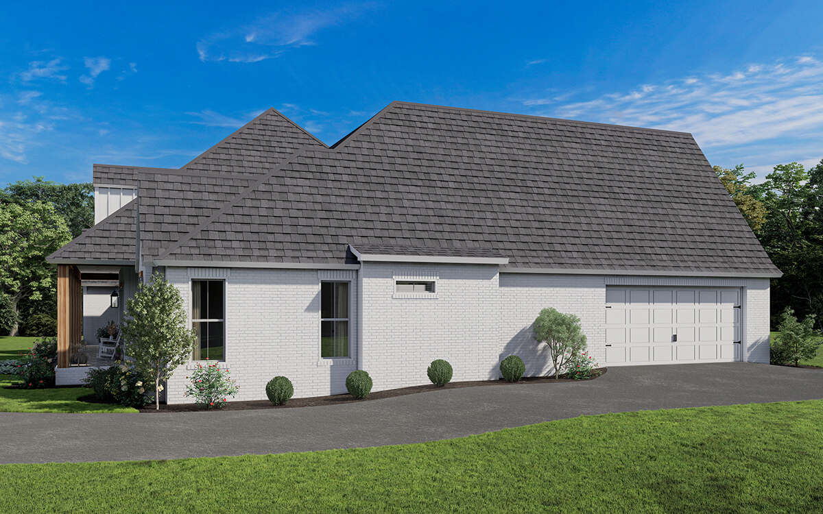 The exterior reflects the timeless appeal of modern farmhouse architecture. Clean gables, generous windows, and a welcoming covered porch create an inviting street presence. The wide layout enhances visual balance while emphasizing the horizontal lines typical of contemporary farmhouse design. Thoughtfully arranged windows provide symmetry and allow natural light to illuminate the interior, giving the home both architectural character and practical daylighting throughout.