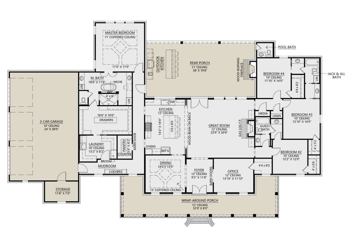 The single-level design keeps all primary living areas conveniently accessible. Bedrooms are positioned strategically throughout the layout to provide privacy and comfort while maintaining convenient access to shared spaces.