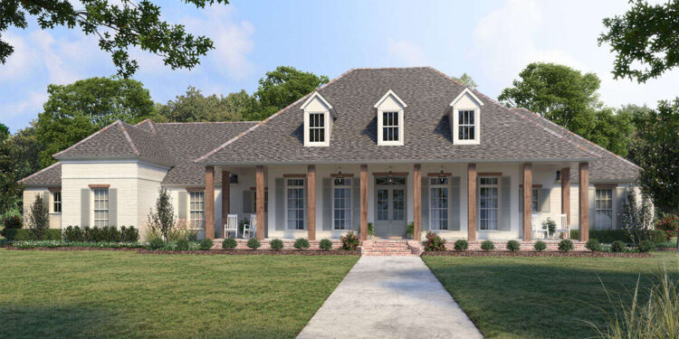 The exterior reflects the refined charm of classic French Country architecture. Graceful rooflines, balanced windows, and carefully crafted proportions give the home a stately yet welcoming appearance. This architectural style often combines Old World elegance with rustic warmth, producing a design that feels both sophisticated and comfortable. The broad front elevation enhances curb appeal and creates a strong visual presence while maintaining a sense of harmony across the façade.