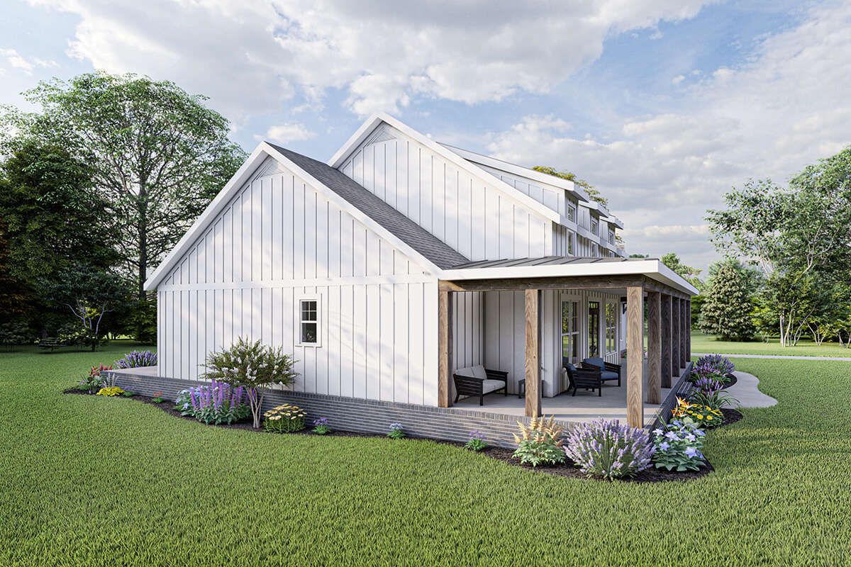 This modern farmhouse design provides a lifestyle centered on comfort, openness, and architectural warmth. The spacious living areas encourage family interaction and social gatherings, while the split-bedroom layout creates peaceful retreats for rest and privacy.