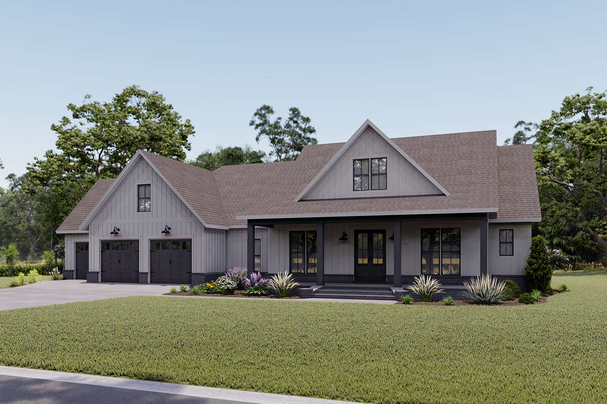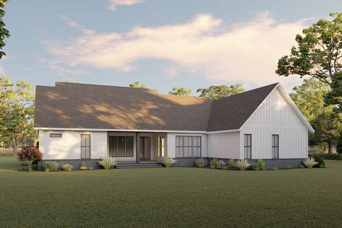 The exterior reflects the welcoming charm that defines modern farmhouse architecture. Strong rooflines, a balanced façade, and a mix of board and batten siding with masonry accents give the home a timeless rural character while maintaining a refined appearance. Large windows across the front elevation add visual rhythm while allowing sunlight to brighten the interior.