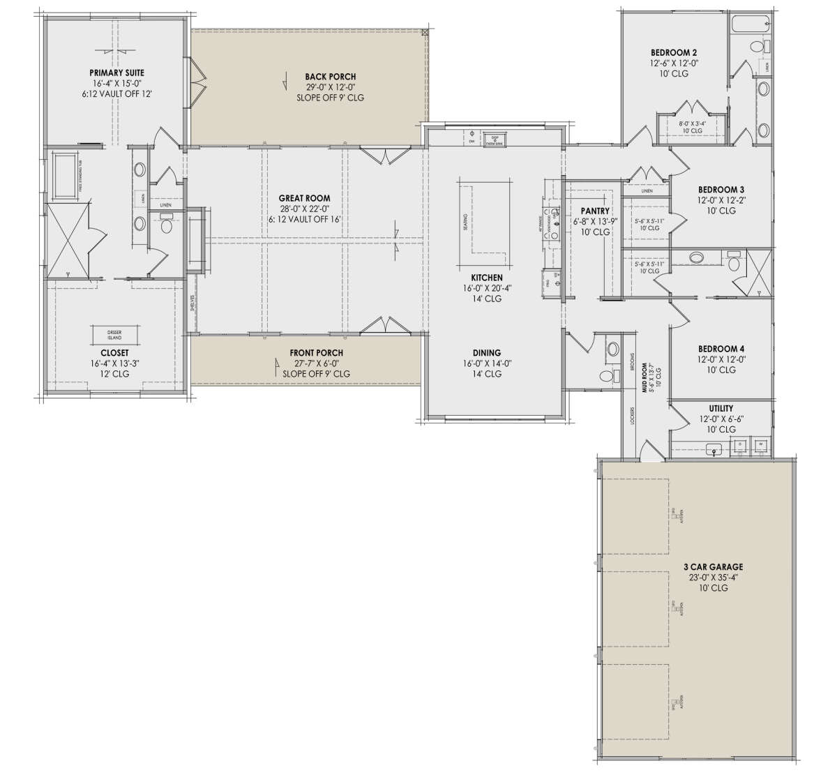 3224 sq ft Modern 4-Bedroom One-Story House Plan with 3 Rear Porches