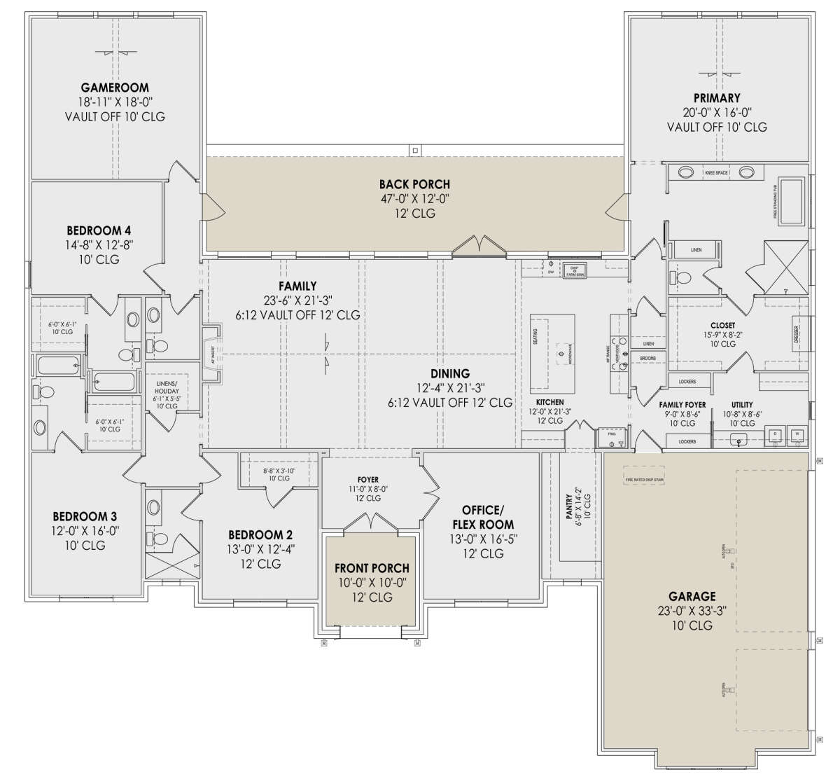 Inside, the floor plan is organized around a large central living area that connects the great room, kitchen, and dining spaces. This open arrangement allows daily activities and social gatherings to flow naturally between rooms while maintaining clearly defined functional areas.