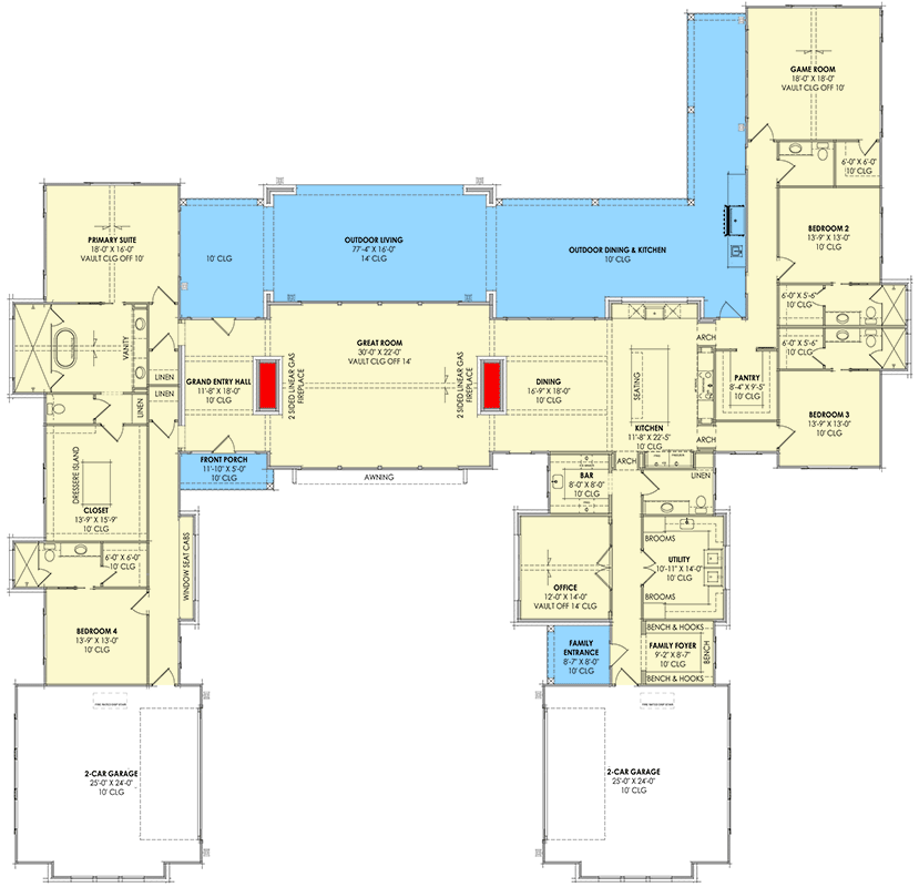 The interior layout begins with a grand entry hall featuring soaring ten-foot ceilings that immediately establish a sense of openness. From this entry, the floor plan flows into the expansive central living areas where the great room, kitchen, and dining spaces are arranged in an open-concept configuration.